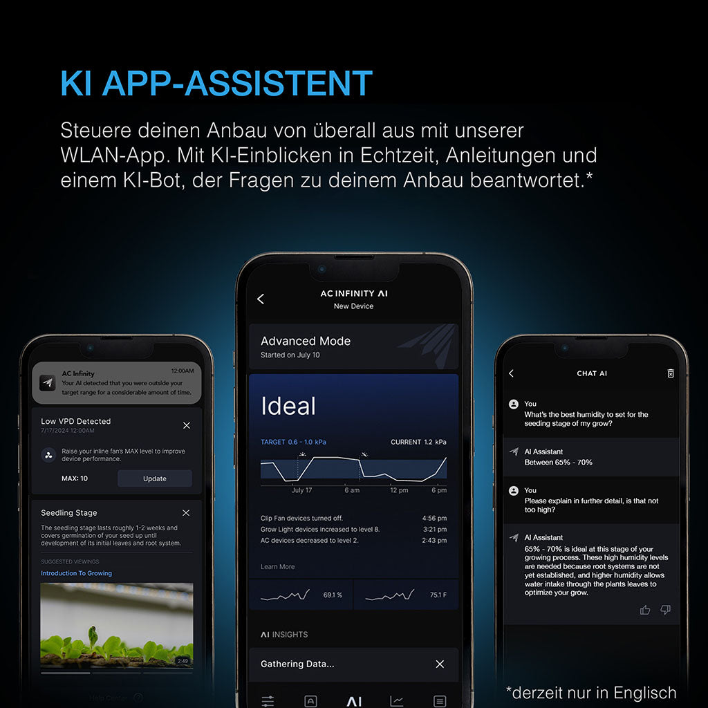 CONTROLLER AI+ überwacht deinen Grow-Bereich und arbeitet mit dem Inline-Lüfter zusammen, um die Umgebung anzupassen und ein stabiles Klima sicherzustellen. Er geht weit über simples Ein/Aus-Schalten oder reine Timer-Programme hinaus: Das System lernt kontinuierlich weiter, analysiert frühere Ergebnisse, um Über- oder Unterschwingen der Leistungsstufen zu vermeiden und dein Klima noch besser zu optimieren. Verbinde diesen Controller mit der AC Infinity App, um zwischen zwei KI-Eingaben zu wählen: schnelle, KI-generierte Presets, die sich automatisch anpassen, oder eine fein abgestimmte Steuerung für maximale Individualisierung. Außerdem erhältst du Zugriff auf hilfreiche Grow-Guides, Rezepte, Artikel, Video-Tutorials und Chatbot-Support, die dir das Wissen an die Hand geben, um deinen Anbau weiter zu verbessern.